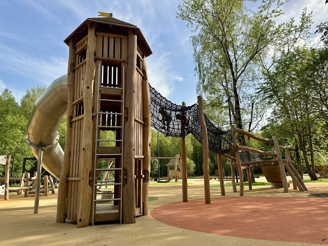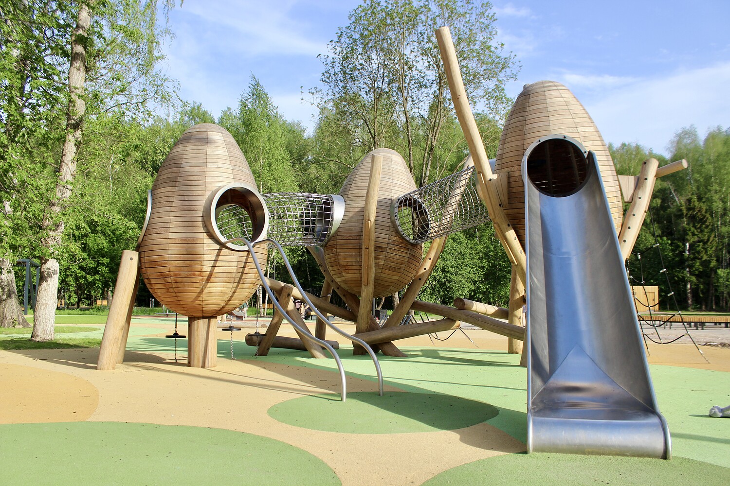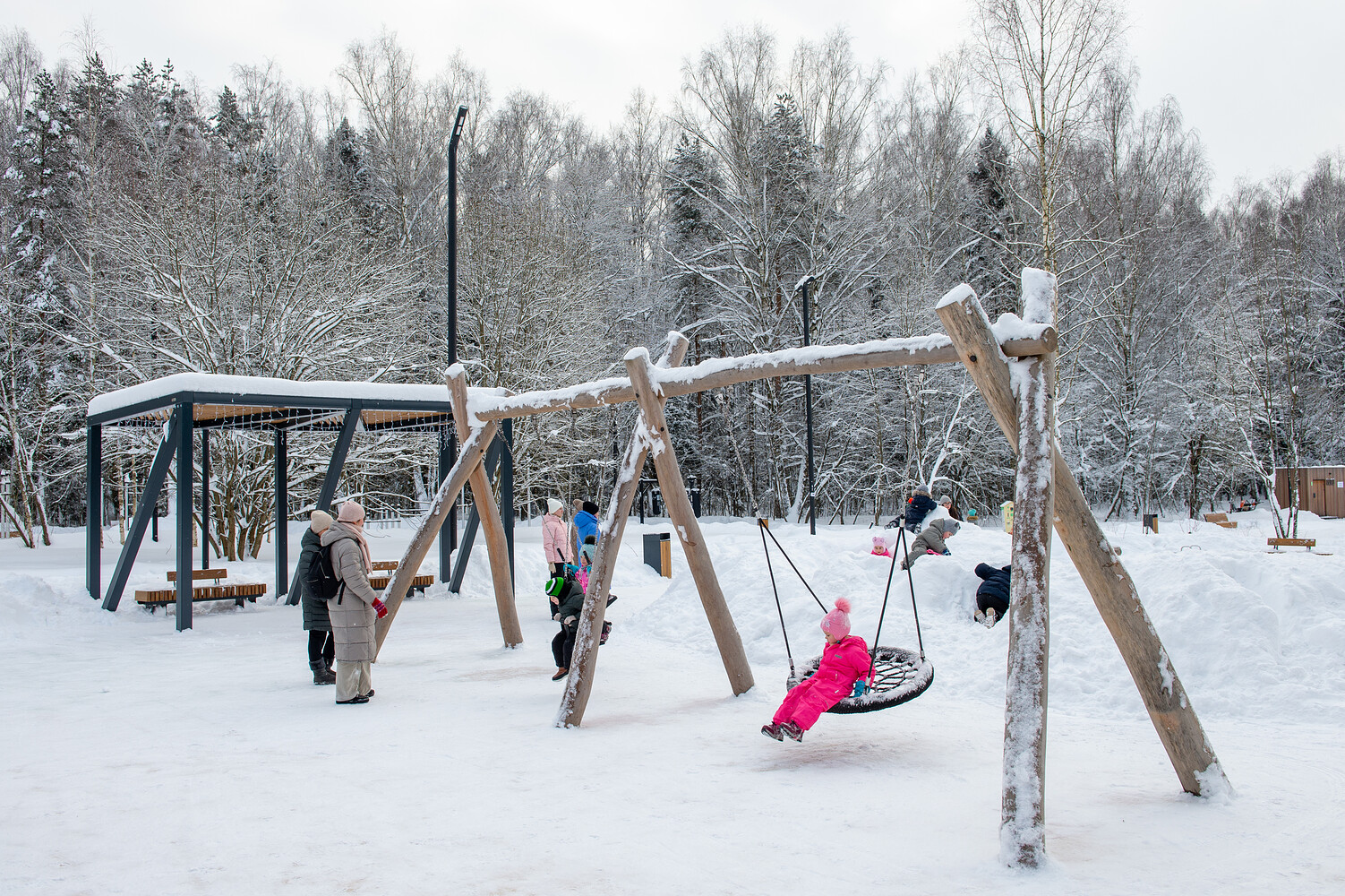 Прогуливаясь по парку, вы найдете две детские зоны с игровыми элементами для разных возрастных групп, шахматные столы, спортивные площадки, в том числе универсальную для игры в волейбол и бадминтон, а также дог-площадку.