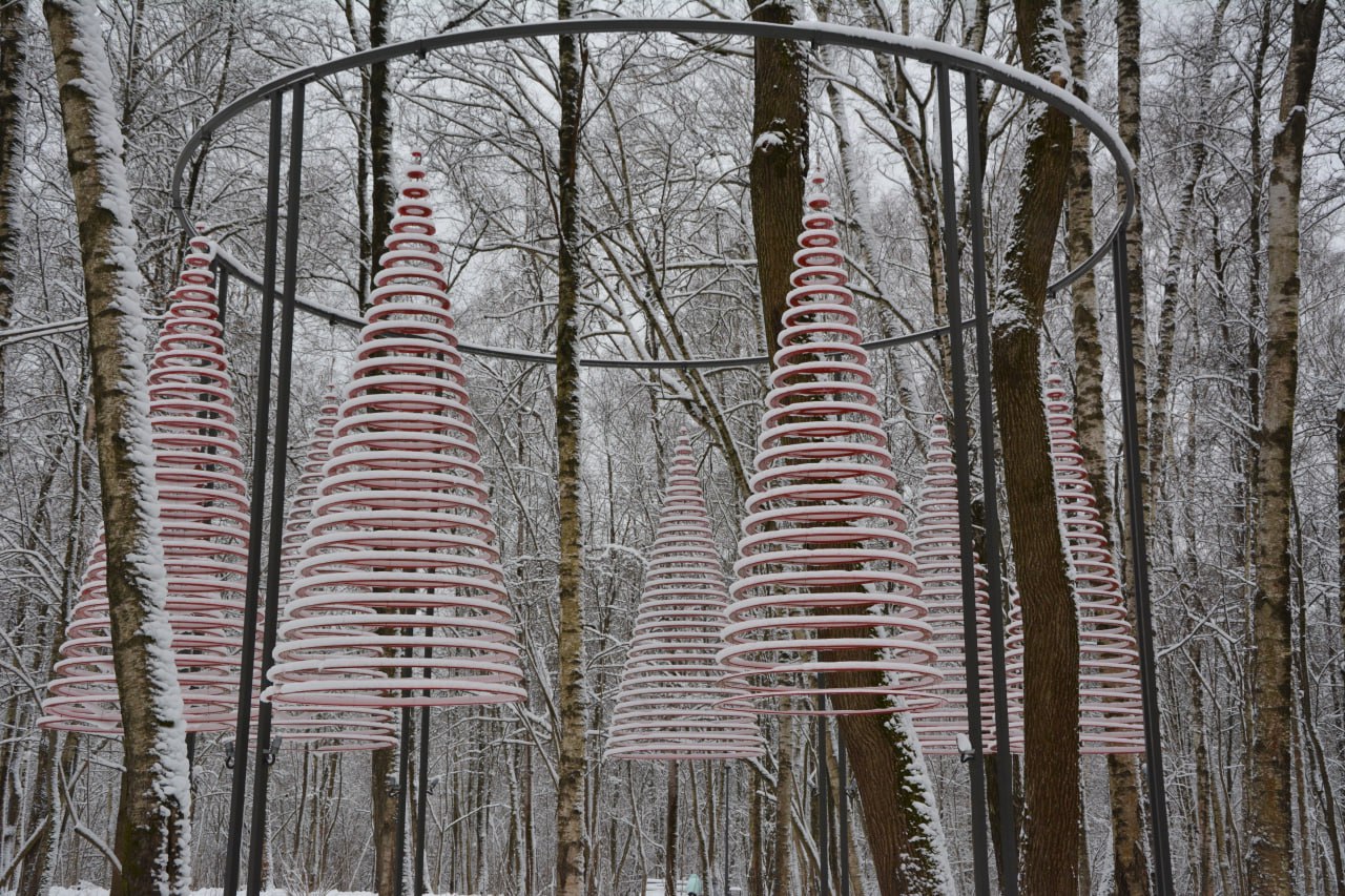 «Хоровод» Аллы Урбан — это восемь конусов, которые художница ассоциирует и с юбками крестьянок с картины Казимира Малевича «Девушки в поле» (1928-29) из Русского музея, и с рупорами, принимающими сигналы с небес.