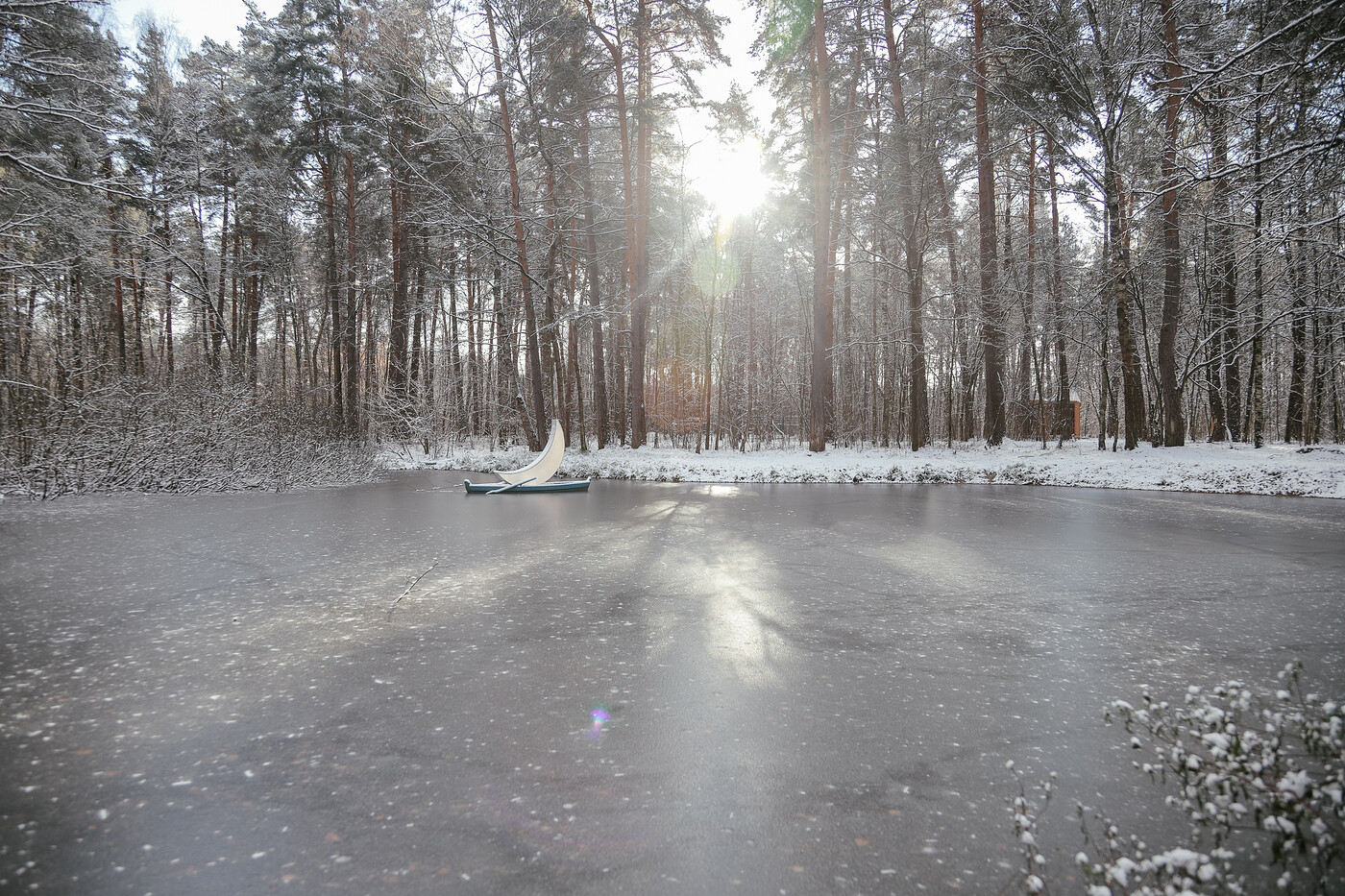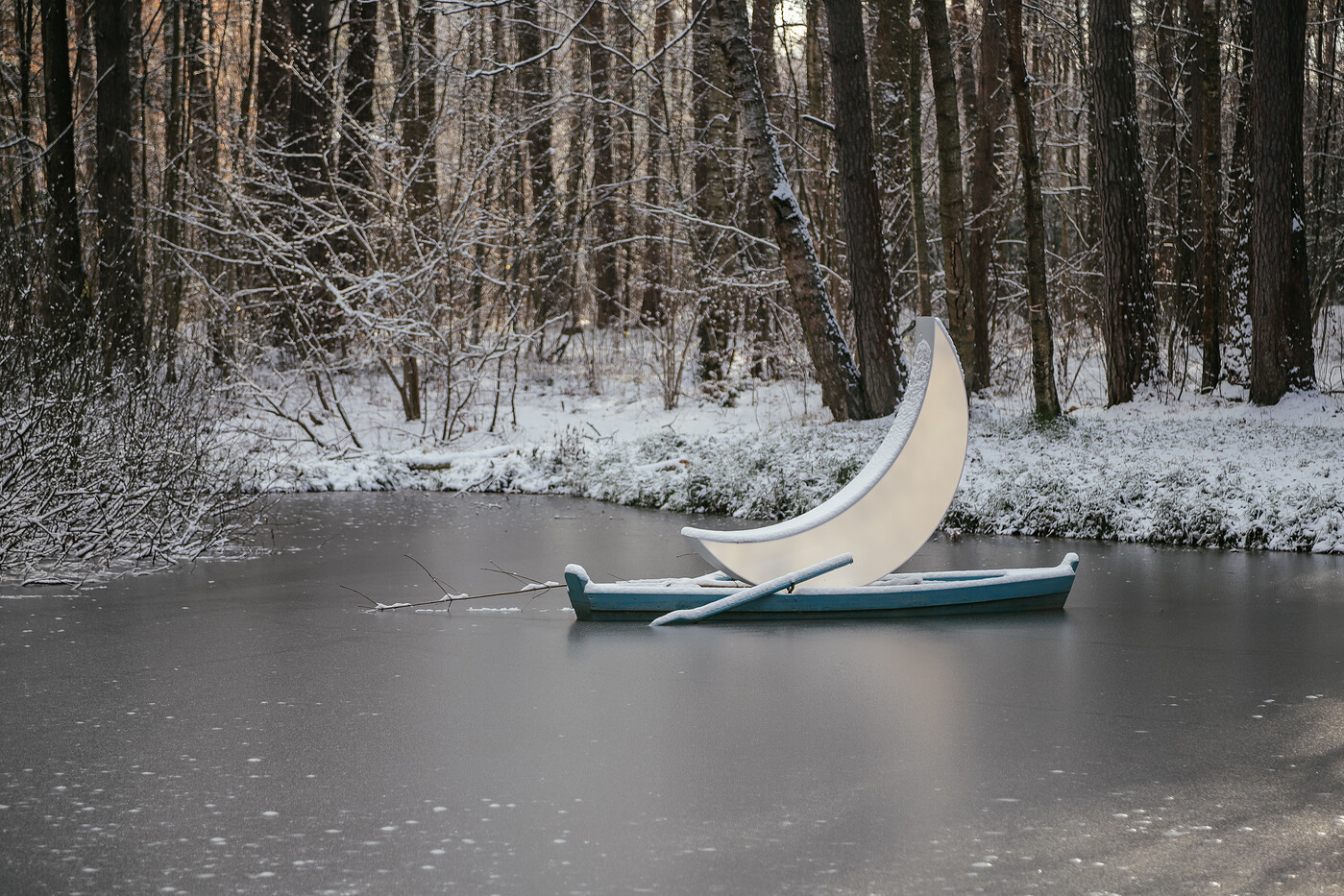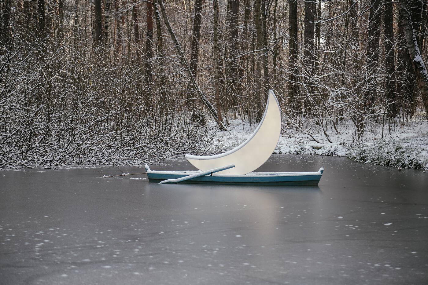 Эта чудесная луна в лодке — большая путешественница. Леонид Тишков впервые создал ее в начале 2000-х. С тех пор она побывала в огромном количестве уголков нашей страны и мира: висела на раскидистых экзотических деревьях в Сингапуре и на Тайвани, принимала участие вместе с художником в научной экспедиции на парусной шхуне по водам Арктики, где чуть не застряла во льдах… Она была в Париже, Лондоне, Риге, Линце, Милане, Берлине, Праге, Бухаресте, в Токио. Теперь она живет в Парке Малевич.